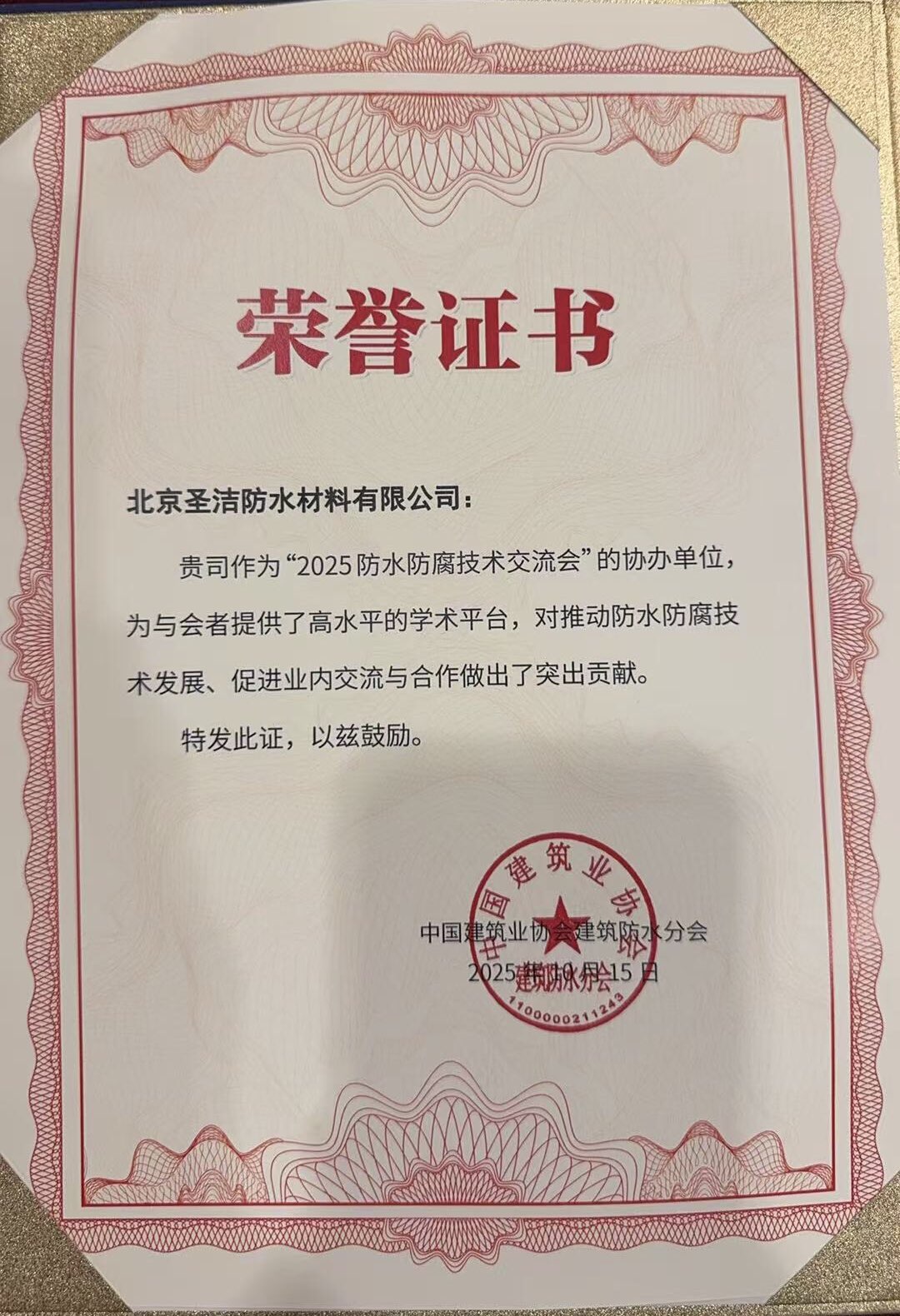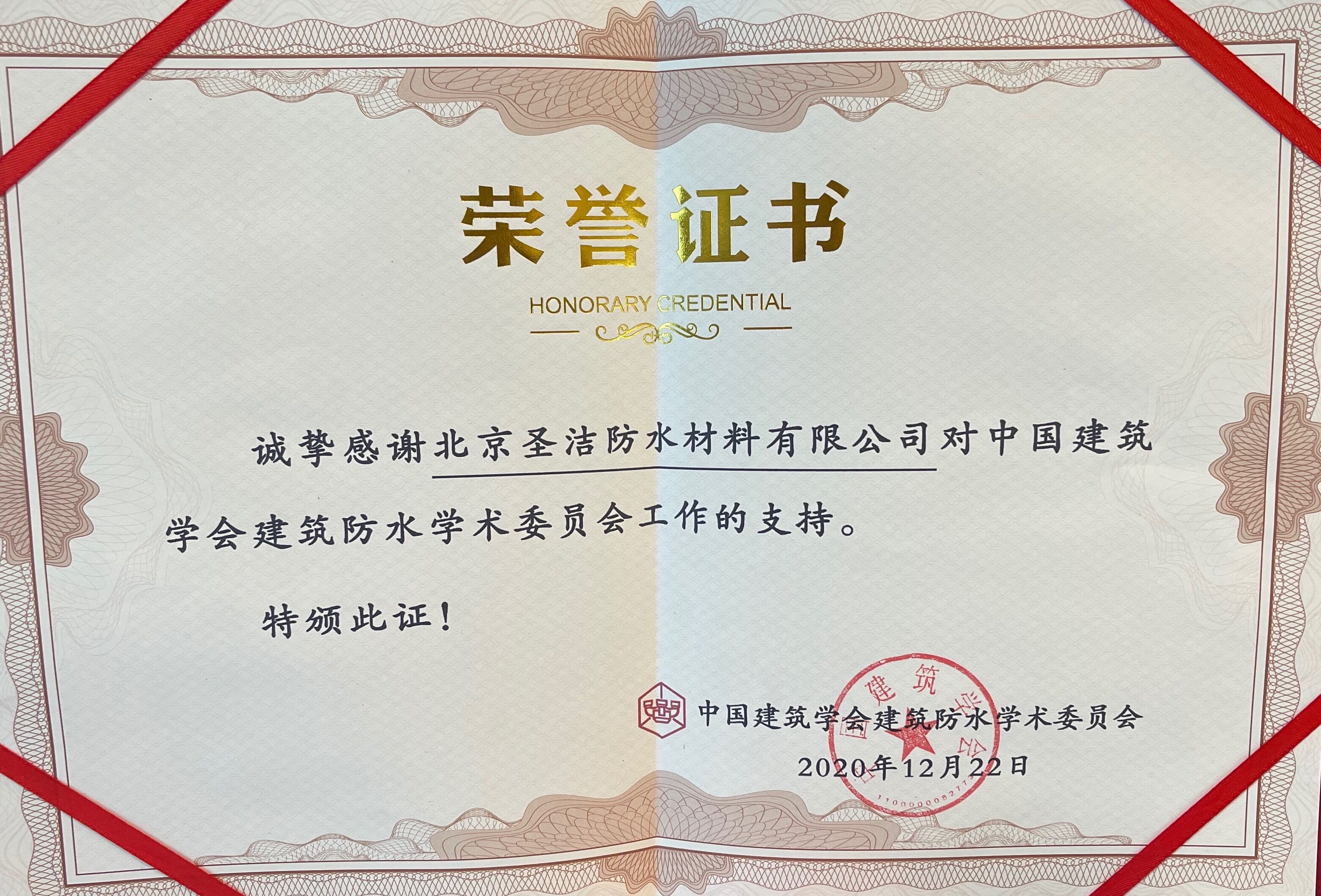 • 中國建筑學會建筑防水學術委員會榮譽證書