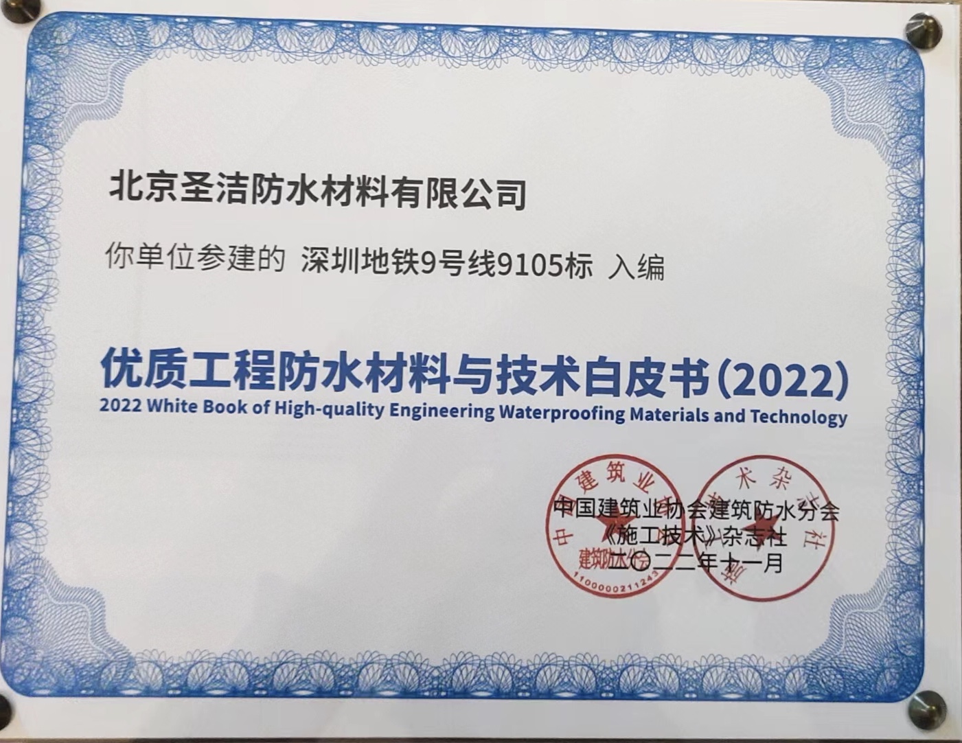 • “深圳地鐵9號線9105標段防水工程”獲