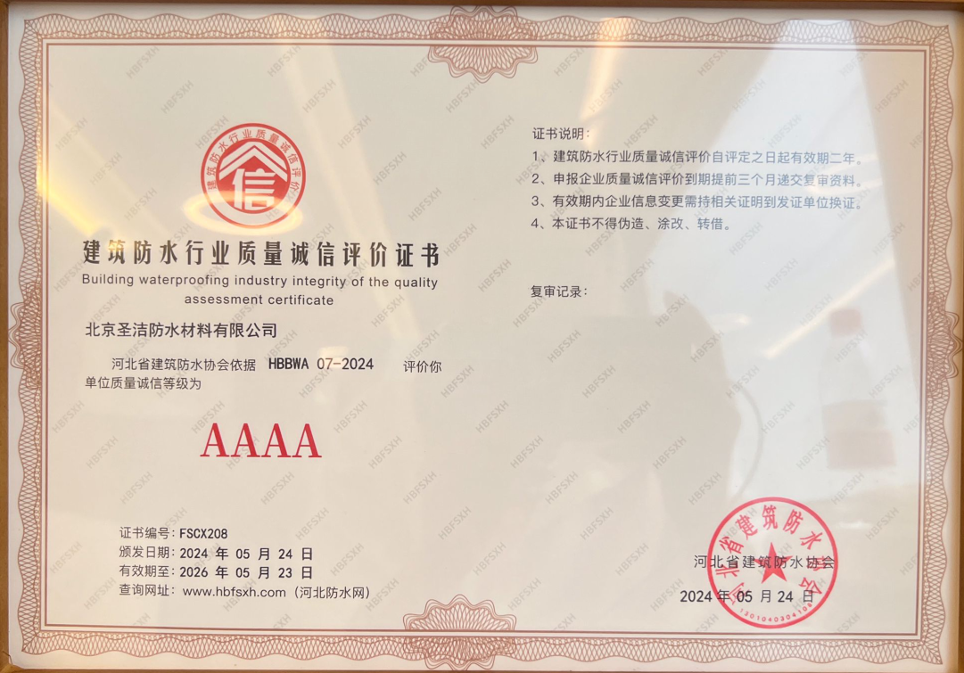 • AAAA建筑防水行業質量誠信評價證書